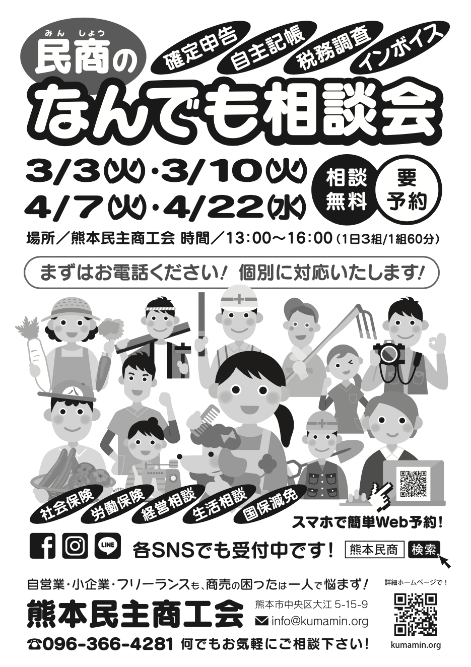 確定申告でお困りの方、インボイスや記帳・税務調査・労災加入・社保・国保など、商売の困ったは何でも民商へご相談ください! 安心の個別対応ですのでぜひこの機会に。電話、SNS、Googleフォームで予約受付中です!