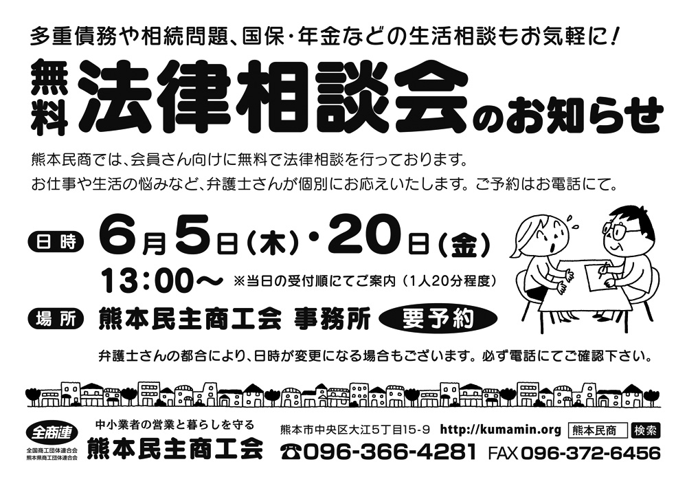 会員さん向けに毎月行われている、熊本民商の「無料法律相談会」が今月も5日(木)と20日(金)に行われます!