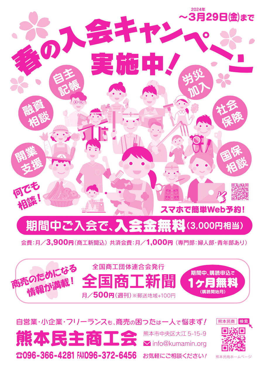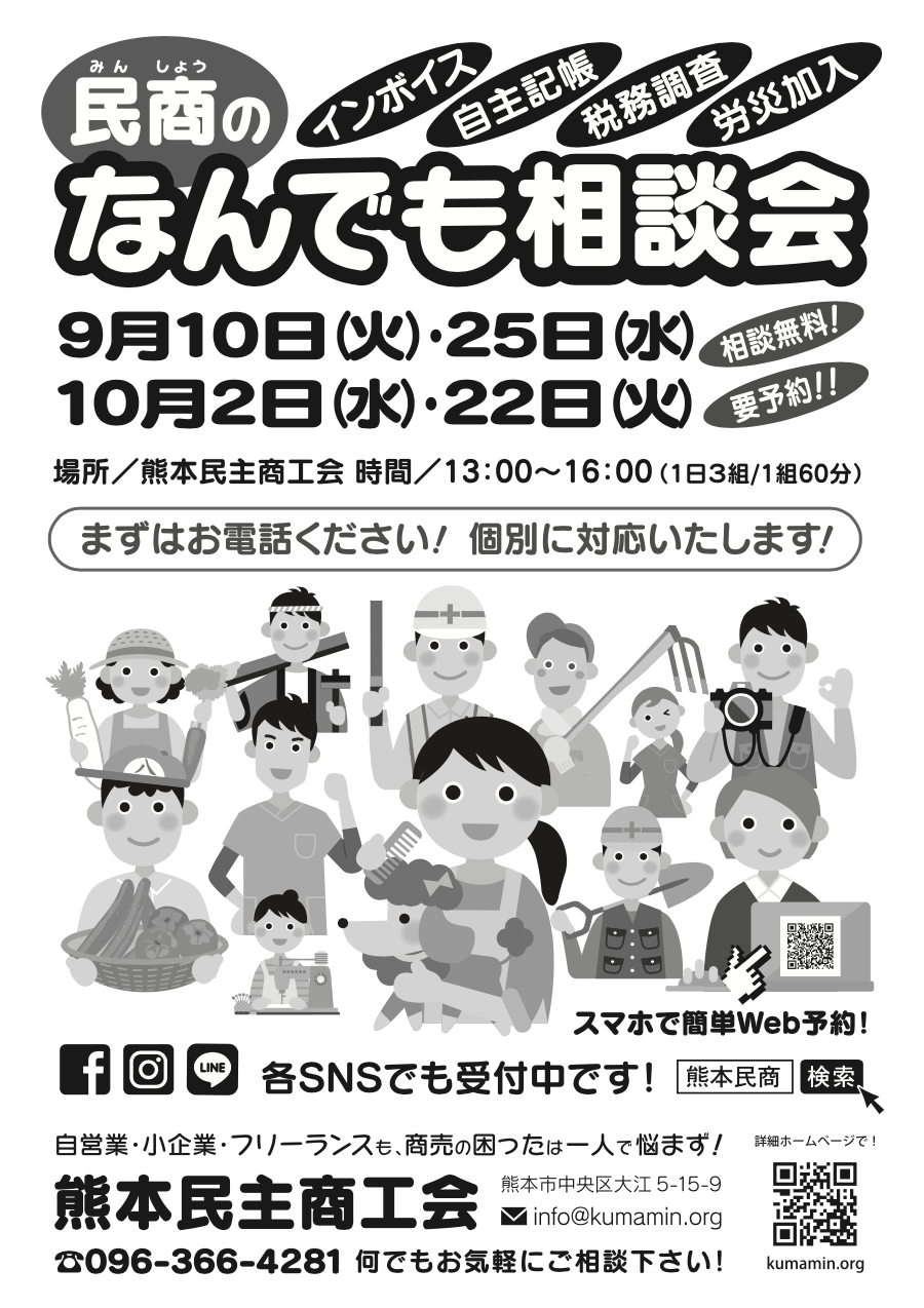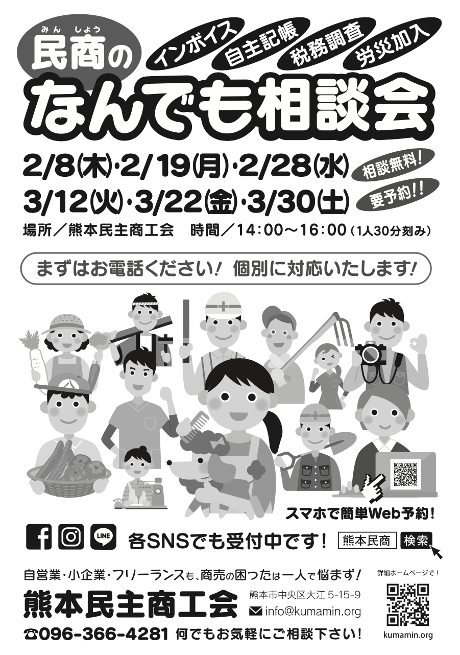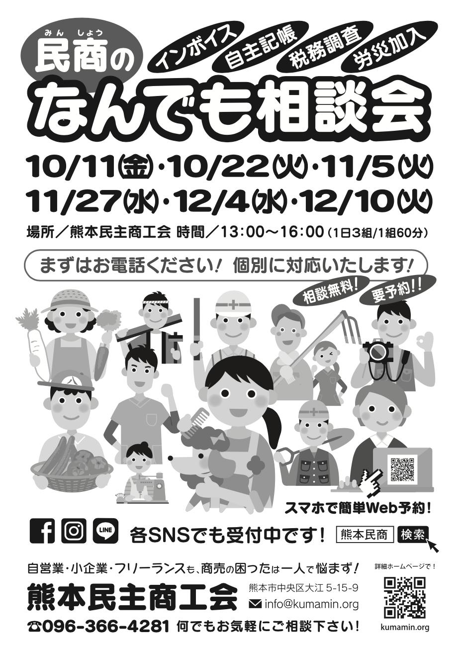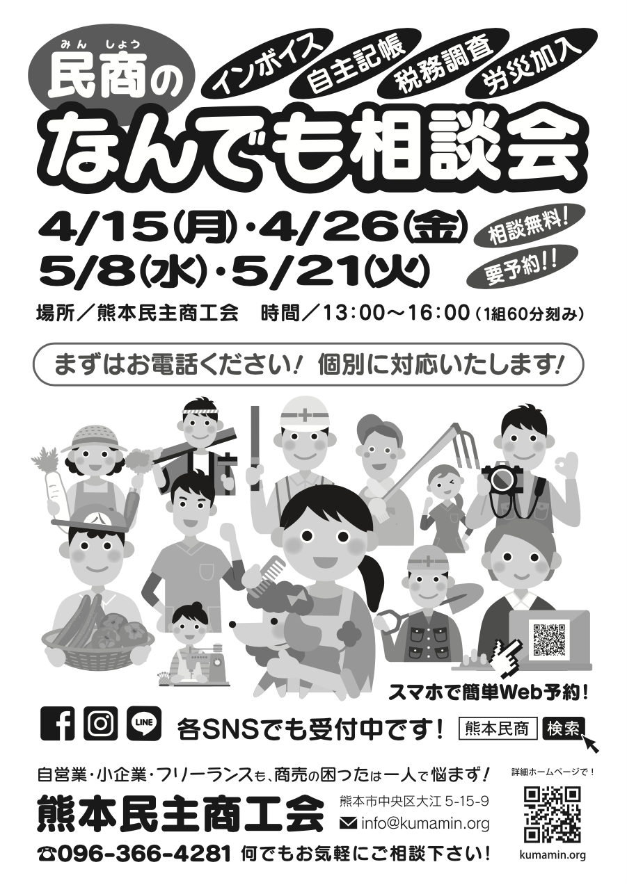 昨年の秋から復活した熊本民商の「なんでも相談会」ですが、4月以降も続けて開催する事になりました! 経営でお困りの方、インボイスや記帳・税務調査・労災加入など、商売の困ったは何でも民商へご相談ください! 安心の個別対応! 対応時間も1時間となりました。電話、SNS、Googleフォームで予約受付中です!