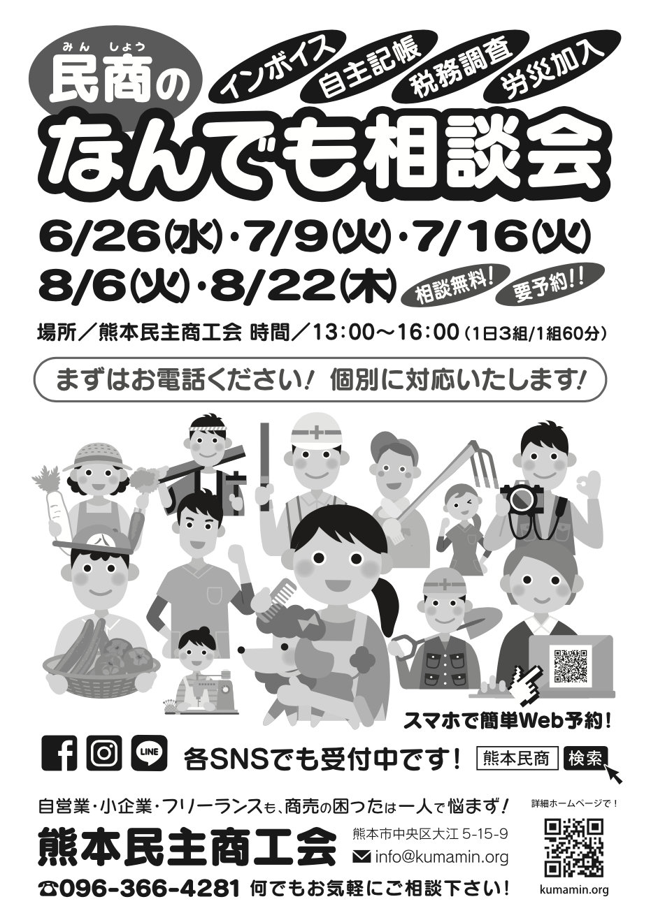 経営でお困りの方、インボイスや記帳・税務調査・労災加入・社保・国保など、商売の困ったは何でも民商へご相談ください! 安心の個別対応ですのでぜひこの機会に。電話、SNS、Googleフォームで予約受付中です!