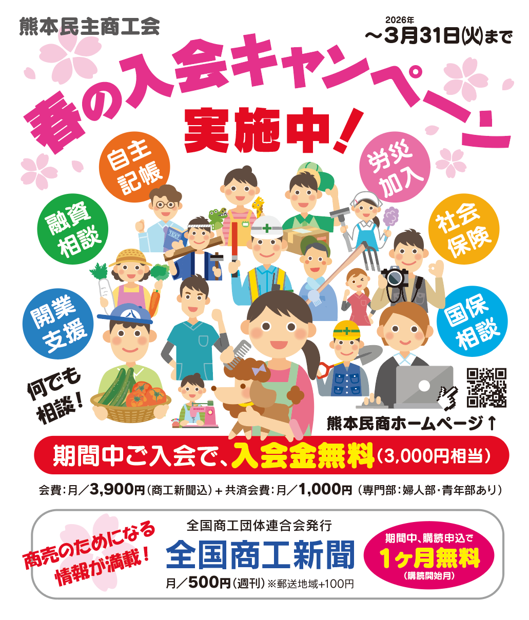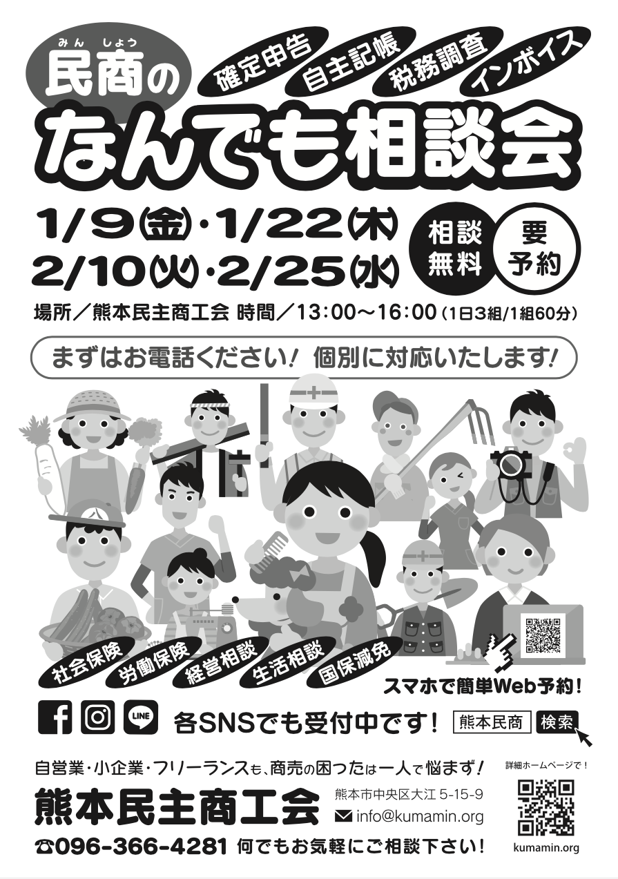 確定申告でお困りの方、インボイスや記帳・税務調査・労災加入・社保・国保など、商売の困ったは何でも民商へご相談ください! 安心の個別対応ですのでぜひこの機会に。電話、SNS、Googleフォームで予約受付中です!